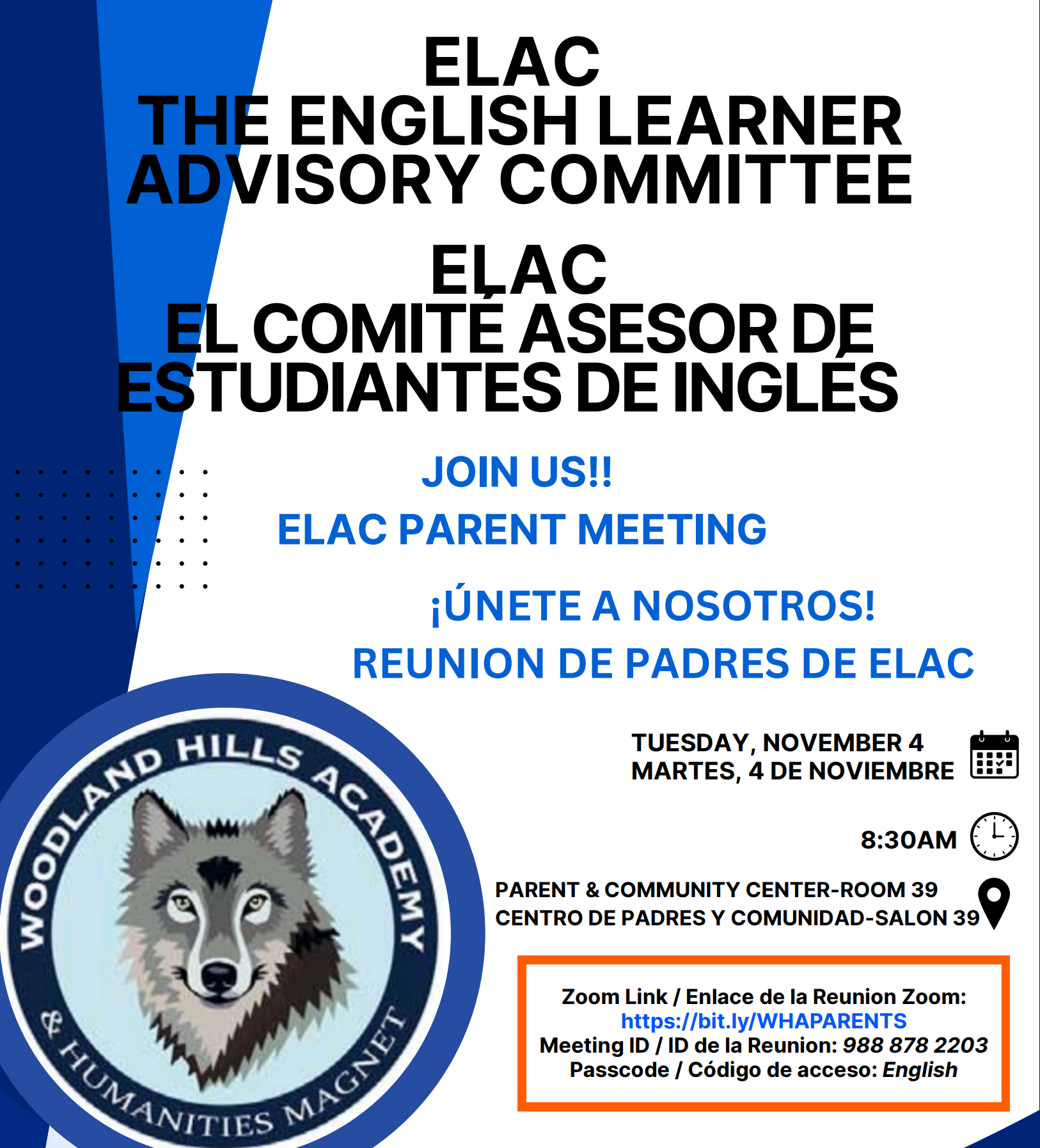 English Learner Advisory Committee - Tuesday, November 4 - 8:10 AM - Parent Center