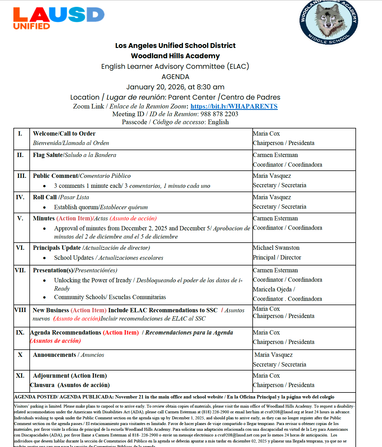 ELAC Agenda - Tuesday, 1/20/26 - 8:15 AM